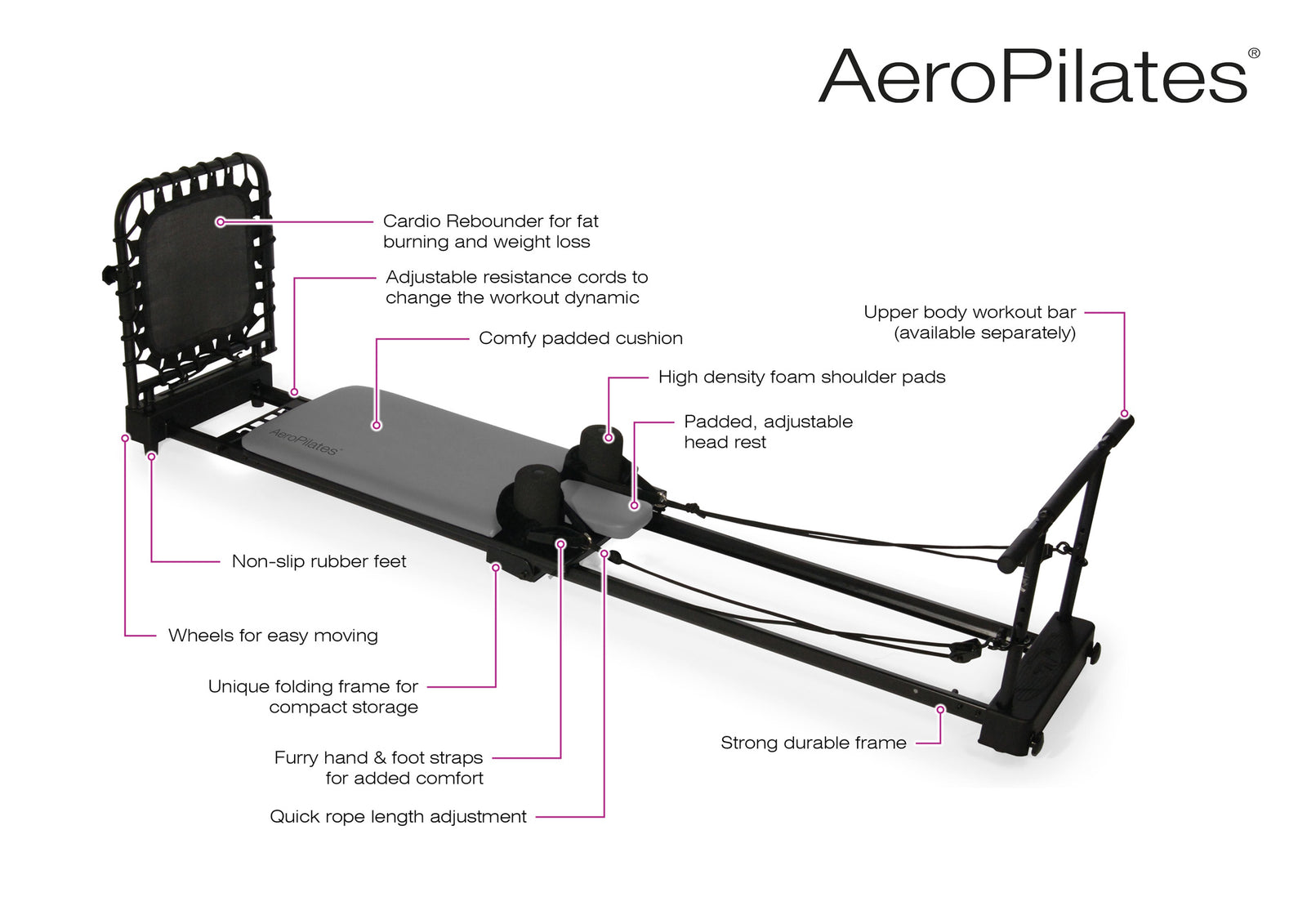 This reformer features the Cardio Rebounder - a vertical trampoline providing a cardiovascular workout without jarring your joints; and a foot bar for performing traditional pilates exercises.